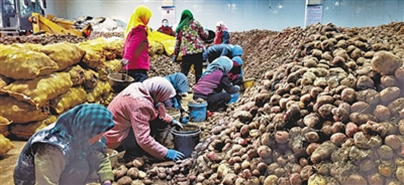 好水乡水磨村的钱海莲和同伴也是一帮忙人。她们天天摸黑出门到家门口种植大户家的库房里分拣马铃薯,一天能获得100多元的报酬。