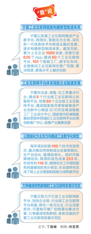 宁夏在冶金、装备、化工等重点行业,建成6个行业级工业互联网公共服务平台,培育60个企业级工业互联网平台,建成国家级共享智能铸造产业创新中心铸造3D打印及铸造智能工厂工业设计中心、国家面向机械装备基础零部件领域的工业互联网平台应用创新推广中心,助推产业集聚发展