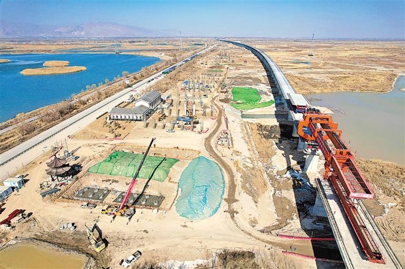 3月6日,包银铁路石嘴山特大桥正在加紧建设。该桥全长39公里,共采用预制箱梁602榀,预计7月中旬全部架设完成。记者 马楠 王洋 摄