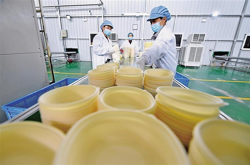 3月14日,宁夏青林华源科技有限公司,工作人员正在打包淀粉基环保餐盒。近年来,石嘴山市深入推进科技创新“双倍增”行动,全市高新技术企业数量达102家,为加快重点产业转型升级、推动经济高质量发展注入强劲动力。 记者 王晓龙 白茹 实习生 郑朝辉 摄