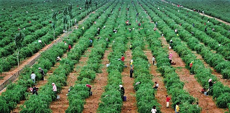 每年6月左右是宁夏枸杞芽的丰收季。在一个个枸杞芽菜种植基地,手持竹篮的村民们蹲在田间摘芽,采摘后的枸杞芽被迅速运到不远处的生产车间进行加工,经过分拣、清洗、漂烫等工序后,就能直接打包发货。