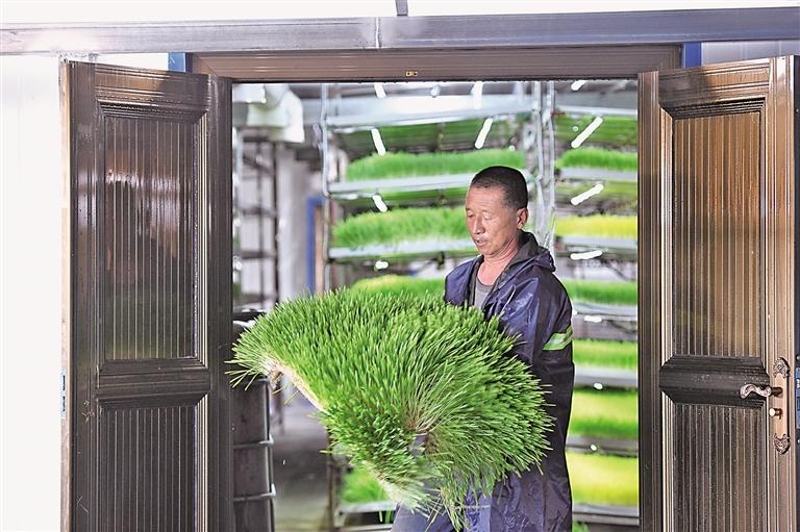 工厂管理员搬运成熟大麦饲草。育草工厂一天产出两次鲜草,分别供应奶牛的午餐和晚餐。