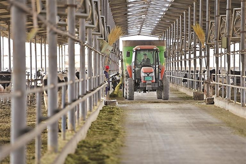 中午,投料车将掺杂着大麦草的饲料拌匀后投喂奶牛。