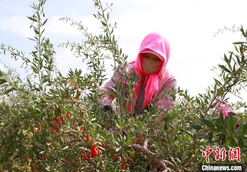 6月15日,在宁夏红寺堡区百瑞源原生态枸杞种植基地,数百名采摘工人一手拎起枸杞枝条,一手小心逐粒采摘,熟练地略过青果、小果、顷刻间,颗颗饱满红果便轻而缓地落入竹筐内。
