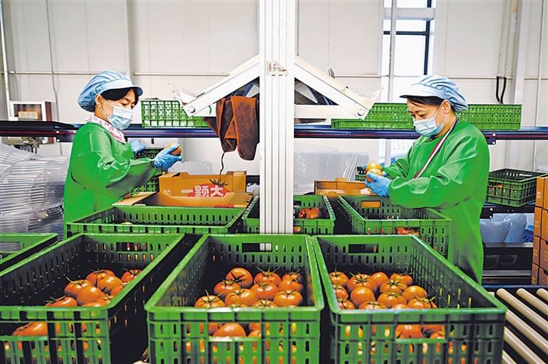 10月22日,永宁县闽宁镇凯盛(银川)现代智慧农业产业园,工人们在分拣包装番茄。该产业园每天约采摘8吨至10吨番茄,目前已进入盒马鲜生、叮咚买菜、美团买菜等零售渠道,通过天猫、京东、拼多多等电商平台销往全国各地。记者 王鼎 摄