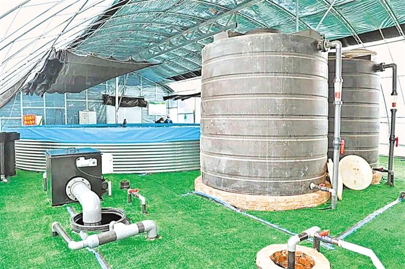 枣香村“鱼菜共生”的温棚内,换氧设施24小时不间断运行。