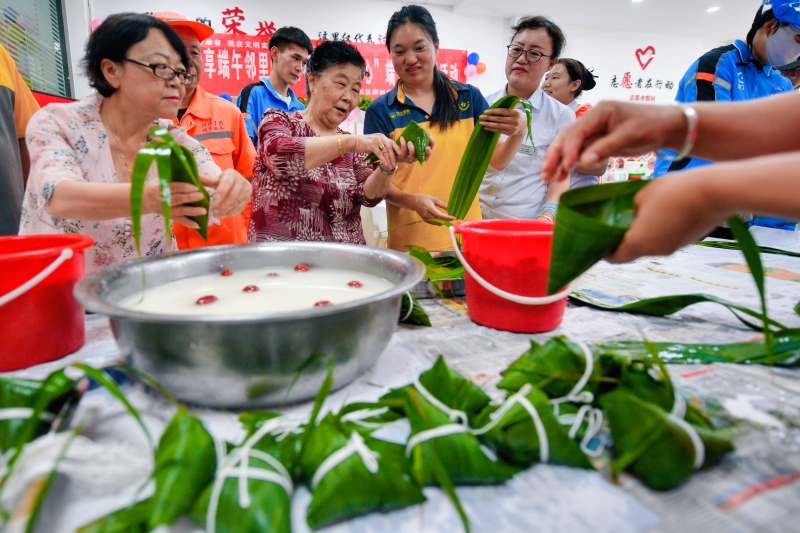 6月5日,银川市兴庆区银古路街道丽水社区联合工会、新时代文明实践站邀请辖区居民、辖区单位职工一同包粽子迎接端午节。 记者 马楠 王洋 摄