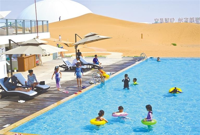 7月11日,游客在中卫市沙坡头旅游景区感受沙漠与黄河的雄浑和神奇。随着暑假来临,该景区迎来旅游热潮。记者 左鸣远 摄