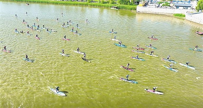 7月13日,参赛选手挥桨击水。当天,由国家体育总局水上运动管理中心、自治区体育局、石嘴山市人民政府主办,石嘴山市委宣传部、石嘴山市文化体育旅游广电局等部门承办的2024年中国桨板精英赛石嘴山站在星海湖开赛。 记者 苏峰 龚依然 摄