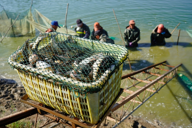 工作人员将捕捞的鱼装车。