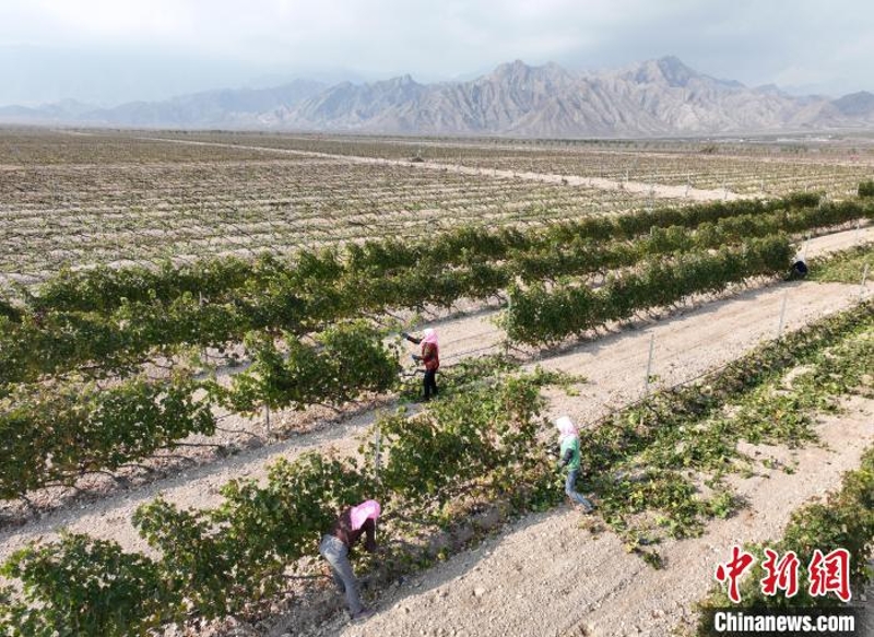 10月30日,工作人员在位于宁夏银川市贺兰山东麓一葡萄种植基地给葡萄藤剪枝。(无人机照片)