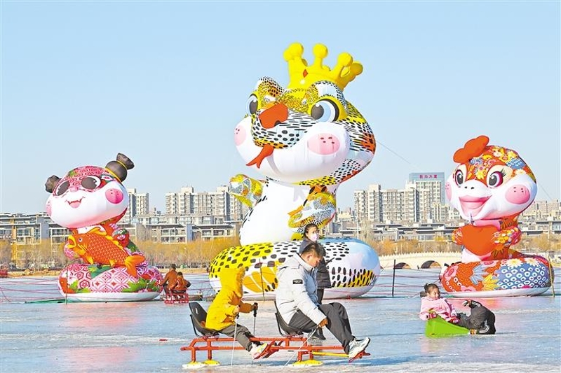 1月6日,“迎蛇年贺新春”巨型卡通玩偶亮相银川北塔湖梦幻冰雪世界。当天阳光明媚,气温回暖,吸引了众多市民体验冰雪乐趣。记者 左鸣远 摄