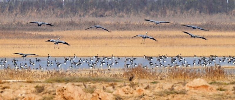 11月11日,在宁夏沙湖自然保护区东侧的湿地上,数千只鸟儿在休憩、嬉戏。近年来,该保护区大力实施沙湖水体生态修复工程,湖水质量得到了有效提高,湿地生态系统恢复了原本的生态功能,大量珍稀植物和鸟类得到保护,越来越多的鸟类选择在此停歇、栖息,昔日稀客变成今日常客。记者王猛 李涛 实习生 杨燕丽 摄