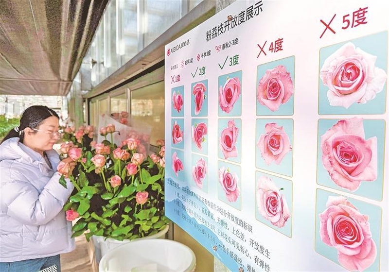 温室内贴有花卉开放度示意图,指导农户正确采摘。