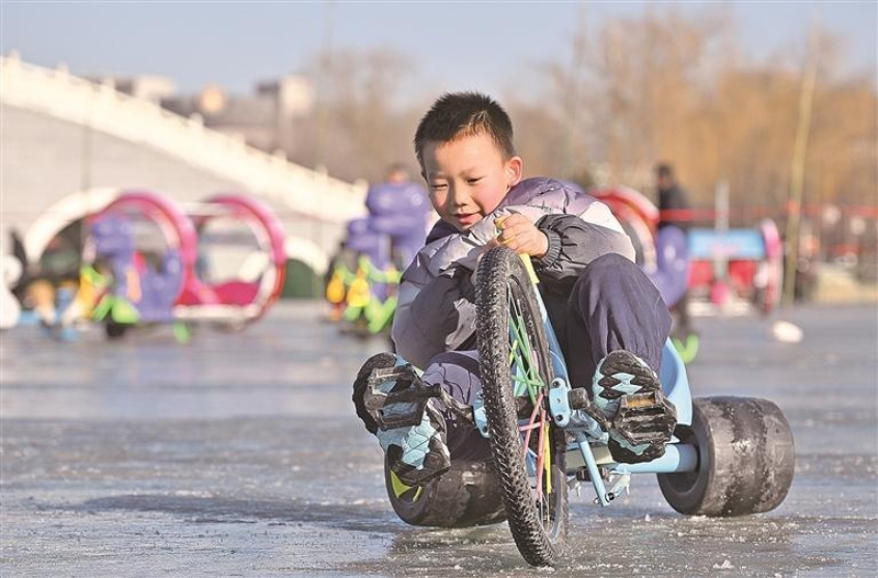 此外,城市公园的冰上乐园成为市民休闲的好去处。海宝公园、宝湖公园、丽景湖公园打造冰上体验区,推出冰上竞速赛车、传统冰车、滑雪圈、冰上自行车等项目。孩童嬉戏玩闹,成年人重温童趣,冰面之上欢声笑语不断。