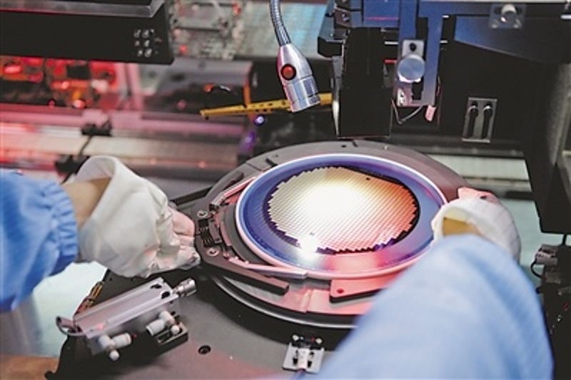 九天智能科技(宁夏)有限公司生产车间内,工作人员将切割好的晶圆装入模块智能组装系统。