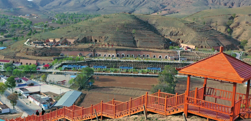 山势不高,车路过时,我们发现山上建起了黄色的木质阶梯。孙世瑞说,2021年,麻黄山乡进一步推进何新庄村的生态旅游业,在山上建了999米的登山步道。这个木质阶梯上山有550级,下山有449级。 登到山顶,向北眺望,最吸引人眼球的是何新庄村的何家大院,只见15孔漂亮的窑洞一字排开,绿树掩映间,白色的窑洞宾馆门异常显眼。放眼四望,才发现这里还有砖窑展示馆、33座温室大棚、大片的杏树林、沙滩游乐场和规模养殖场。