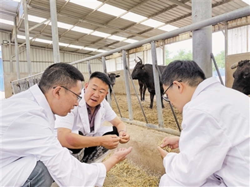 专家王之盛(左)、苏华维(右)帮王瑞刚(中)优化饲草配方。