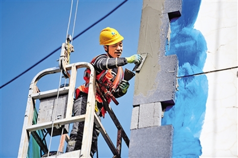 2月28日,银川市金凤区长城中路街道紫园南区老旧小区改造施工现场,工人进行楼体外墙保温层施工。据了解,今年金凤区计划改造16个老旧小区,涉及74栋住宅楼3535户33.32万平方米,总投资约2.06亿元。记者 马楠 王洋 实习生 乔新宇 摄