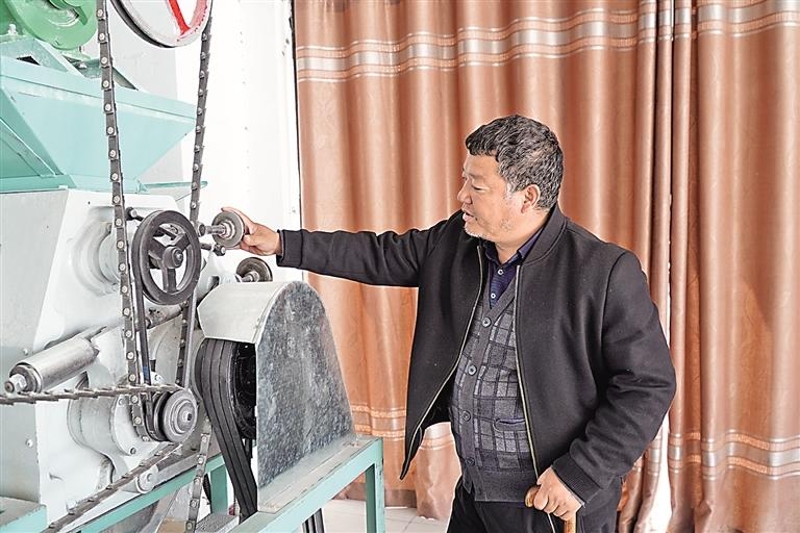谭振龙检查全自动面粉加工机运行情况。