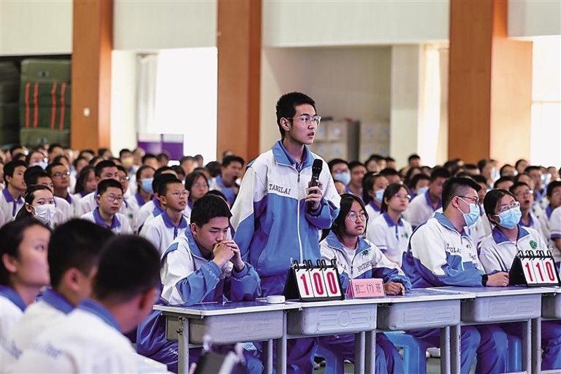 在竞答环节,选手紧盯屏幕,时刻准备抢答。5月19日,银川市唐徕中学南校区初二年级学生在进行知识竞答。当天,银川市金凤区长城中路街道金宇名庭社区团支部联合银川唐徕中学南校区思政教研组开展“铸牢中华民族共同体意识”知识竞赛活动,学生们围绕党的二十大报告、民族法规、民族政策、民族习俗等内容进行知识竞赛。(记者 党硕 摄)