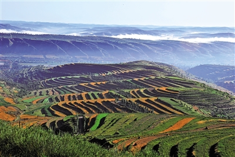 彭阳县大沟湾流域梯田壮观迷人。经过多年综合治理,这里生态恢复良好。(图片由自治区水利厅提供)