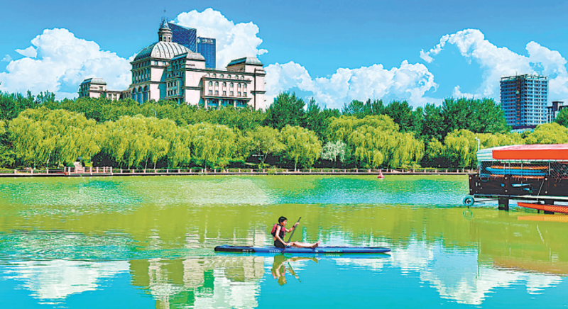 7月25日,一位桨板爱好者在典农河上练习。目前,银川市湿地面积达5.31万公顷,自然湖泊、沼泽湿地近200个,为人们提供了良好的休闲场所。 记者 马楠 摄