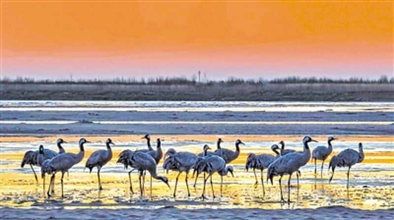 2019年,村民不再耕种河滩地,银河村的生态得以恢复。每年8月,银河湾湿地的芦苇、野苜蓿能长到2米高,稀疏的红柳也慢慢长成了3000亩的天然红柳林。植被丰富了,鸟类相约而至。白天鹅、白琵鹭等都是村里的“常客”,被称为“鸟类大熊猫”的国家一级保护野生动物大鸨、中华黑鹳也在这里出现。7年前发现灰鹤近50只,去年能观测到近5000只。今年还发现了白尾海雕、白枕鹤、白头鹤等珍稀鸟类。