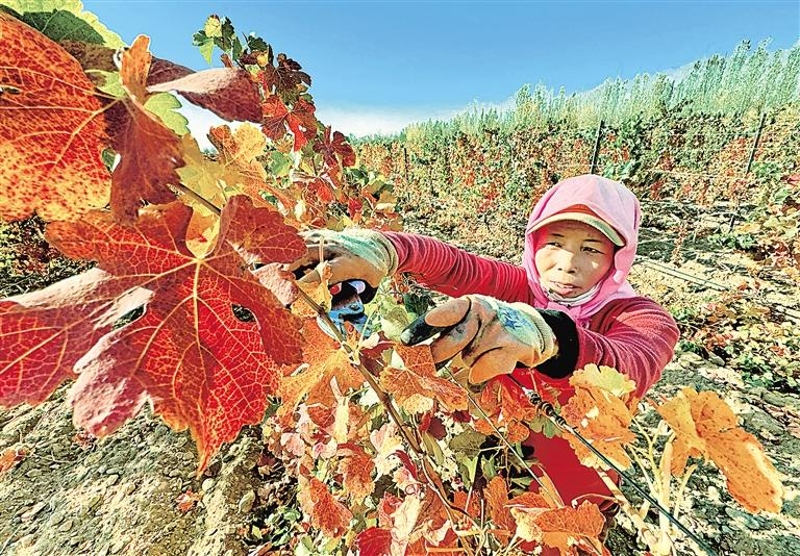 “今年10月下旬气温偏高,无霜期较长,到现在为止葡萄树上的叶片还没完全脱落,这样葡萄藤养分回流期时间就比较长,对于树体的养分储存非常有利。”苏旺春说,剪枝后会进行最后一次滴灌,随后埋土进入休整期。覆土冬埋,不仅能够起到保温抗冻的作用,还能减少水分蒸发,有利于来年出土展藤。(记者 王婧雅 马楠 文/图)