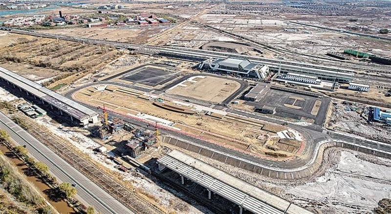 11月14日,从空中俯瞰正在建设的包银高速铁路石嘴山南站,“山”字造型的站房主体已具雏形。包银高速铁路银川至惠农段长约101公里,预计2024年建成通车。记者 王晓龙 摄