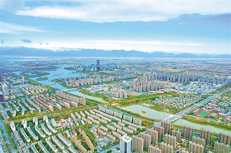 典农河湖水充盈、鸟类翱翔,成为塞上湖城流动的美景。