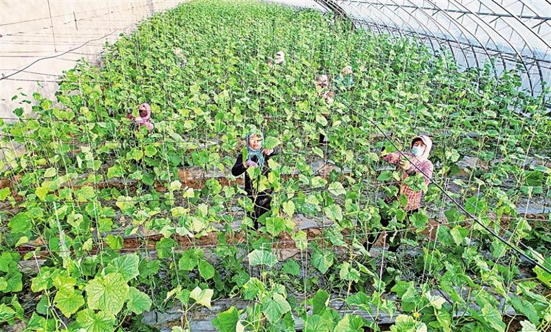 11月26日,石嘴山市大武口区星海镇隆惠村百果园“三个零”技术示范产业园现代化日光温棚内,一根根水果黄瓜错落有致地挂在叶间,农户忙碌其间。该产业园建在盐碱地上,采用零化学肥料、零化学农药、零化学激素的种植方式,产出的水果黄瓜在上海、深圳、广州等地供不应求。 记者 王晓龙 摄