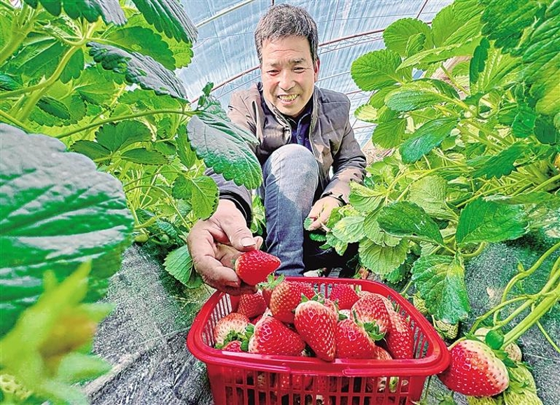 11月28日,银川市金凤区良田镇和顺新村村民柳占江在自家的温棚中采摘草莓。近年来,和顺新村采取“党支部+合作社+企业”联合发展模式,建设768栋设施温棚,建成和顺新村果蔬仓储分拣中心(西红柿交易市场),吸引全国各地百余家收购商前来洽谈合作,实现从移民薄弱村向产业大村的华丽蜕变。记者 马楠 王洋 摄