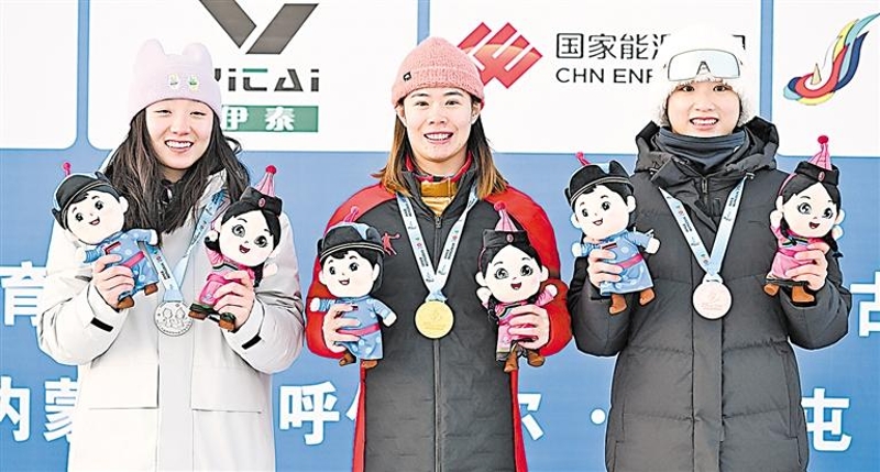 2月21日,孔凡钰(中)在女子公开组自由式滑雪空中技巧比赛中获得金牌。