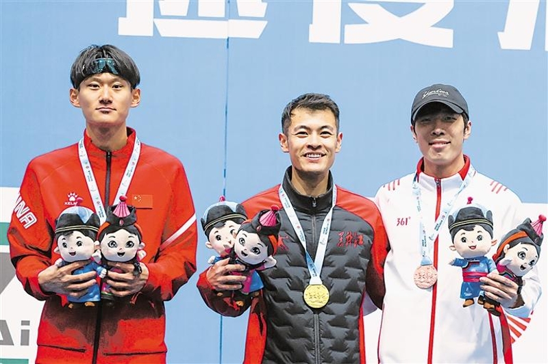 1月11日,冠军宁忠岩(中)、亚军王浩田(左)和季军廉子文在颁奖仪式上合影。当日,在第十四届全国冬季运动会速度滑冰公开组男子1000米比赛中,宁夏队选手王浩田以1分08秒83的成绩获得亚军。