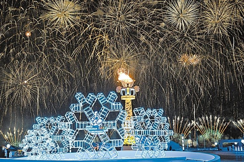 冬运会火炬在冰天雪地中熊熊燃烧。