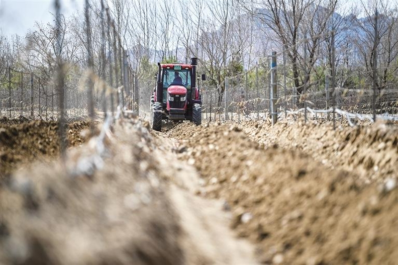 很快,拖拉机开进地里,“突突突”地划开一道道沟壑,葡萄园褪去冬装,换上一件洋气的条纹衫。