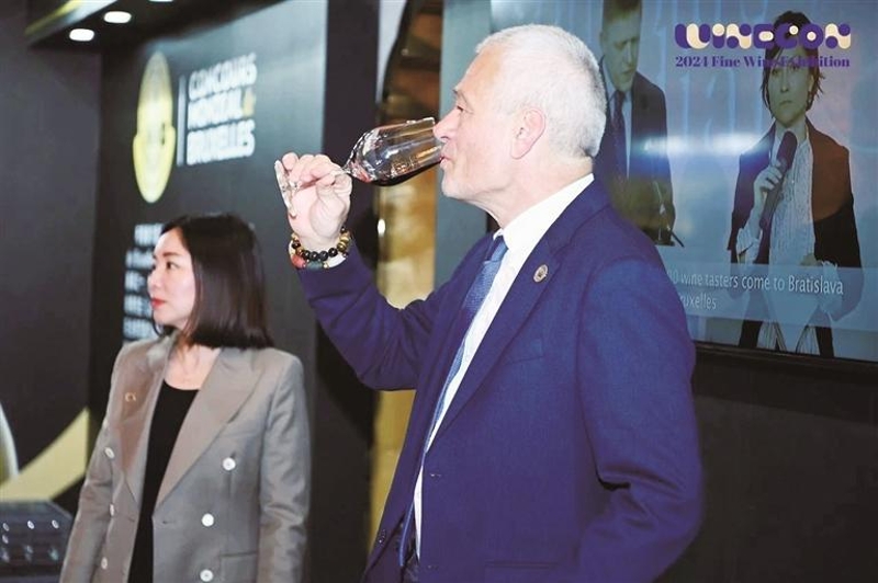 布鲁塞尔国际酒类大奖赛组委会主席卜度安·哈弗先生品鉴获奖的贺兰山东麓葡萄酒。