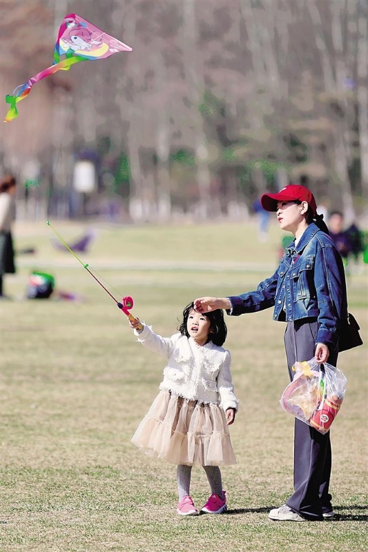 在银川森林公园,家长陪孩子放风筝。记者 马楠 摄