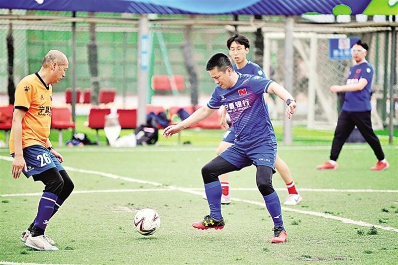 在宁夏体育馆旁的绿茵场上,一场市民足球赛在激烈进行中。记者 马楠 摄