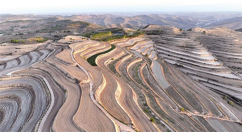 5月15日,西吉县吉强镇龙王坝村,一层层梯田在夕阳下,泛着金色光芒,仿佛是“大地的掌纹”。作为全国乡村旅游重点村,龙王坝村依靠系统综合治理,“种”出风景、引来游客的同时,也缚住了水土,释放多重效益。