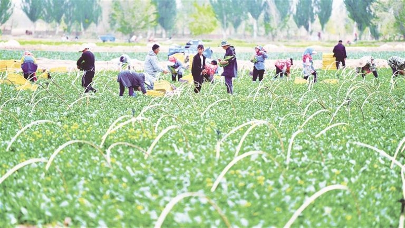 贺兰县立岗镇,宁夏全农农业科技有限公司蔬菜种植基地,农户采收菜心(资料图片)。宁夏发挥比较优势,突出特色发展,提升“六新六特六优”产业的含绿量、含金量、含新量,让各族干部群众看到奔头、增强信心,提升发展的内生动力,推动高质量发展。 记者 马楠 王洋 摄
