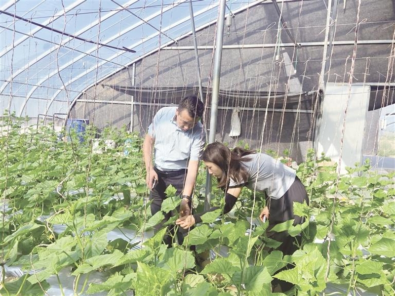 高定成(左)查看黄瓜长势。