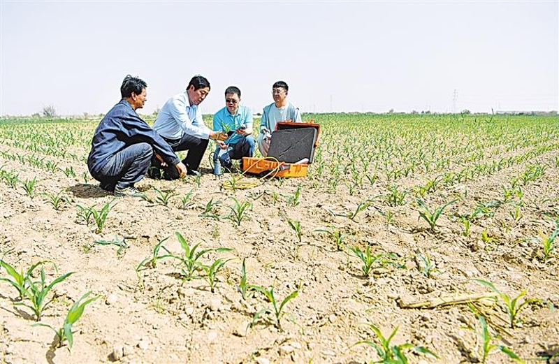 5月21日9时许,西大滩盐碱地改良利用试验站。许兴教授带领科研人员在试验田里检测土壤水分、盐分、温度等指标,地里的玉米苗已长至脚踝处。试验站及其周边现有80多万亩盐碱地,大部分属于盐碱荒地和中低产田。