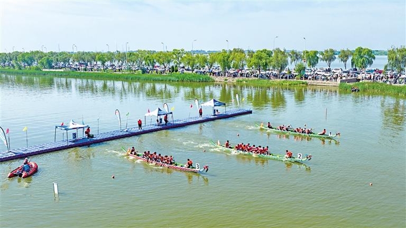 星海湖畔,人山人海。活动在具有浓郁传统文化特色的“画龙点睛”仪式中开幕,现场同步开展了“品味端午,传承文明”的水鼓表演《中国龙》、端午香囊制作、包粽子比赛、剪纸旗袍表演、舞狮舞龙等传统文化活动。同时,活动现场设置休息区、医疗区、水域救援、观赛区、拍照打卡区等区域,让参赛队员和观众有更好的参与感和体验感,保障活动安全有序进行。