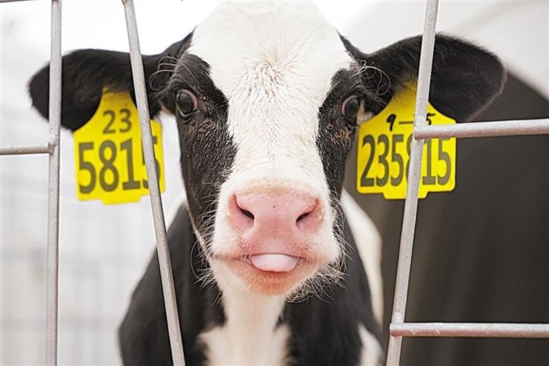 在展示大厅隔着玻璃窗望去,半开放式的狭长牛舍被划分为四个小区域,每头奶牛的耳朵上挂有一个黄色“耳环”。“这是奶牛的电子身份证。”周帅说,这上面不仅有奶牛的编号,还有它的出生日期、身体状况、产奶情况等信息。