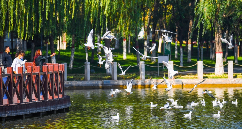 10月15日,成群的红嘴鸥在银川燕鸽湖公园嬉戏,吸引了众多市民拍照。每年9月—10月,成千上万只红嘴鸥从西伯利亚出发,途经银川飞往云南过冬,银川优美的生态环境和优质的湖泊湿地资源吸引它们在此停留。记者 马楠 王洋 摄