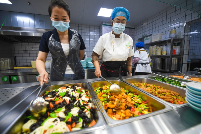 10月16日中午12时,位于贺兰山中路街道双福社区阅海万家F2区东门的“万家·社区食堂”内弥漫着饭菜香气,工作人员正在为有序排队取餐的居民们盛起热气腾腾的饭菜。记者 马楠 王洋 摄