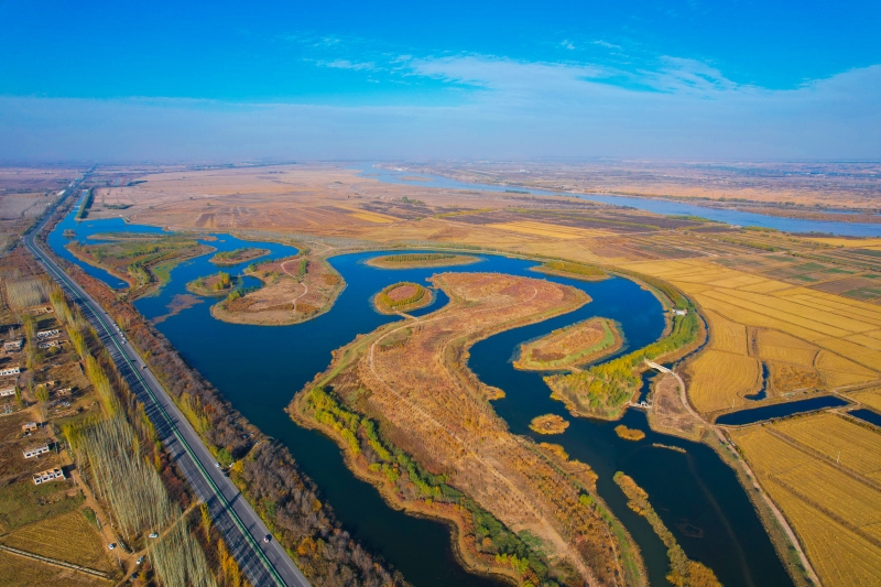 11月4日,空中俯瞰黄河银川段,美如油画。近年来,银川市坚持统筹规划系统治理、岸上岸下综合整治,保护黄河水生态,做足黄河水文章,构建一城活水生态水网,绘就新时代黄河流域生态保护和高质量发展新画卷。记者 马楠 王洋 摄