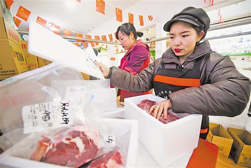 店铺的一角搭设了直播间,镜头前,禹海者忙完线下忙线上,只见她托起一块牛腱子肉贴近屏幕向网友卖力介绍:“家人们看这纹理,现宰现卖,顺丰冷链直达,拍下立减5元!”弹幕飞速滚动,来自全国各地的网友不断发来购买要求,开播短短几分钟就卖出数单。